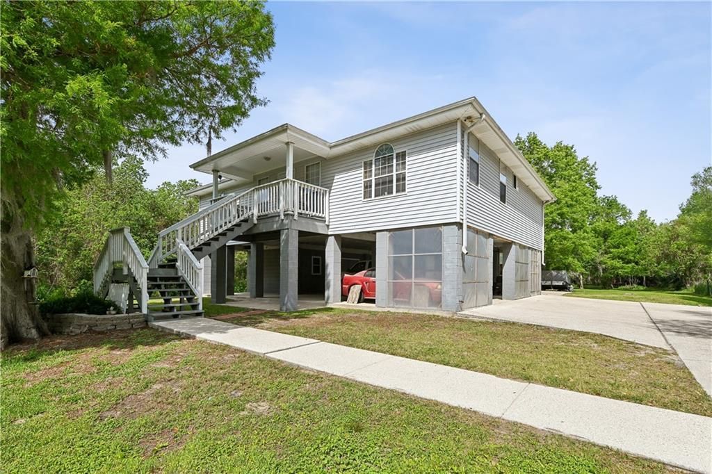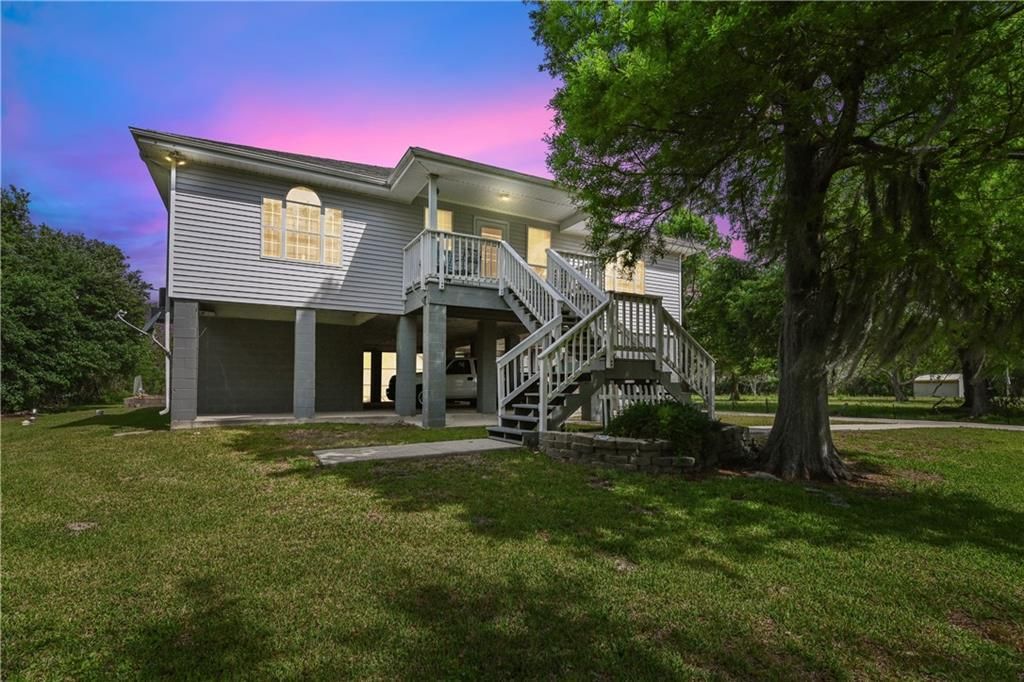 Positioned on over three acres in St. Bernard, this elevated residence offers a thoughtfully designed layout, expansive outdoor space, and a setting that supports both everyday and weekend living. Inside, a spacious open-concept living, dining, and kitchen area creates an effortless flow, allowing each space to feel connected while maintaining its own function. The kitchen is well-equipped with generous cabinetry and counter space and plenty of natural light, designed for daily use and hosting. The primary suite provides plenty of closet space and includes an en-suite bath with an oversized vanity, a walk-in shower and oversized soaking tub. Two additional bedrooms offer flexibility and plenty of storage. Below the home, covered space extends the functionality of the property with room for parking, a workshop, and additional gathering areas. The outdoor setting continues with a fire pit and a wide expanse of open land and lush trees, creating opportunities for entertaining or simply enjoying the surrounding space. With nearby fishing and bayou living, this is truly a must see home in the heart of Sportsman's Paradise.