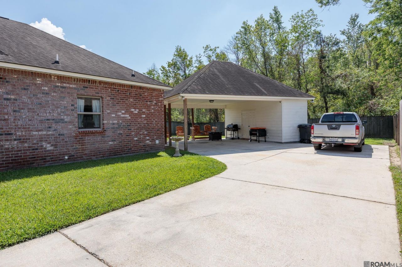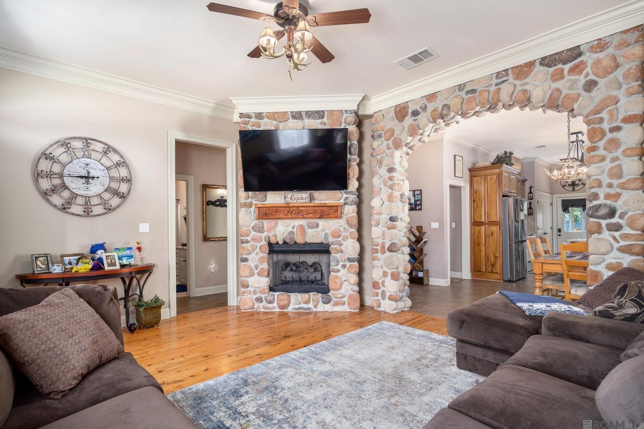 Welcome through the beautiful front door into this charming 3-bedroom, 2-bath custom home located in the desirable Burlington Lakes Subdivision in Greenwell Springs. Offering over 1,500 square feet of living space, this home features quality craftsmanship and unique finishes throughout. The living room showcases beautiful Australian Cypress flooring, while the primary bedroom features Acacia Nolawood flooring. Additional bedrooms offer stained concrete flooring, and ceramic tile is featured in all wet areas. A stunning custom river stone archway and fireplace serve as a striking focal point, creating a warm and inviting space. The home is accented with granite countertops throughout, 9-foot ceilings, and elegant crown moulding. The kitchen bar opens to the dining area, and a convenient computer nook or sitting area is located just across from the dining space. Additional features include an upgraded 3.5-ton, 15 SEER hyper-filtration AC unit designed to keep the home comfortable year-round. A covered rear carport, and an extended driveway with space to accommodate three to four additional vehicles. This charming home offers comfort, character, and thoughtful details throughout.