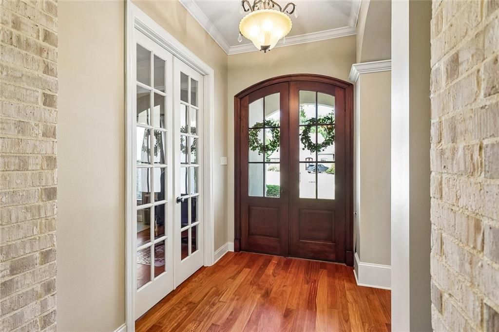 Beautifully maintained 4-bedroom, 3.5-bath home in sought after Southdown subdivision offering a spacious and versatile floor plan. Brazilian wood floors welcome you into the foyer, with a formal dining room to the left featuring a beautiful chandelier and large front-facing window. A dedicated office with a closet is located off the foyer and offers flexibility for a variety of uses. The main living area is accessed through two brick archways and features built-in shelving and cabinetry, an ornate gas fireplace, and a wall of windows overlooking the covered patio and green space beyond. The open layout flows into the kitchen, which includes granite countertops, stainless steel appliances, abundant cabinetry, and generous counter space. A central snack bar provides additional seating, while the breakfast area overlooks the backyard and patio. The kitchen also features a large pantry offering extensive storage. Adjacent to the kitchen is a media room with a closet, providing additional flexible space. The primary bedroom is located on the main level and features Brazilian wood flooring and multiple windows with views of the backyard. The primary suite bath includes dual vanities, a whirlpool tub, separate shower, and two spacious vanities. Upstairs features three generously sized bedrooms with large closets, a connecting Jack-and-Jill bathroom, AND a bath & bedroom ensuite in the 3rd bedroom, great for guests and don't forget the versatile Keeping room. One bedroom, inside the back of the closet includes access to a separate storage space, for seasonal items. The Sellers favorite feature of the house was the large closets in each bedroom and the extra storage space. Additional highlights include a covered rear patio, green space backdrop, and a variety of flexible living areas to suit a range of needs. The 1st floor has been freshly painted. The 2 China cabinets in the Dining room are NOT built in and will NOT stay. Call for your personal showing.