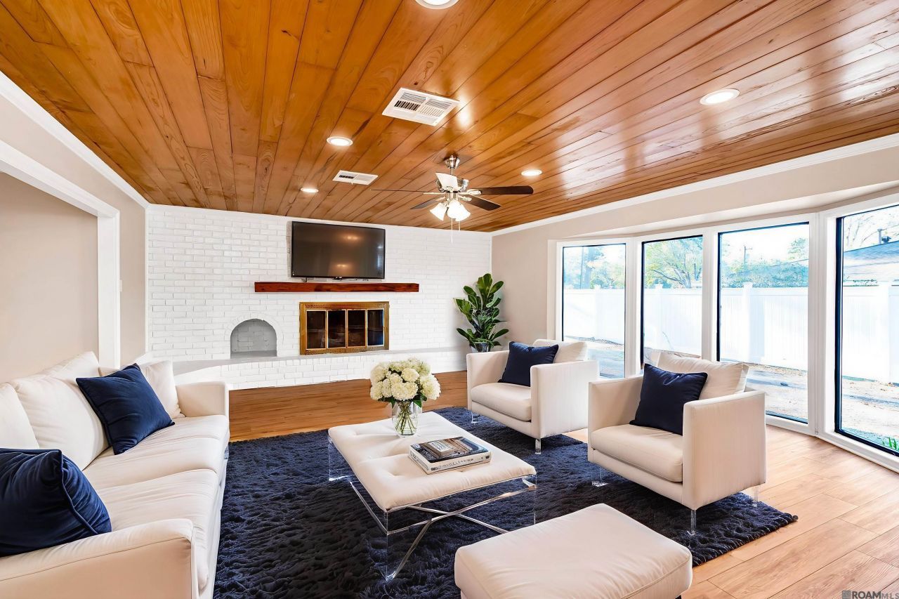 Welcome to 6555 Landmor Dr, a classic Bellingrath Hills home featuring thoughtful updates and renovations throughout including a NEW ROOF and HVAC! This 4 bed/2 bath home sits on over half an acre and includes a shop, offering both space and functionality. As you arrive, you'll notice the covered front porch, mature trees, and a long driveway providing ample parking. Inside, the home opens to a foyer and two distinct living areas, creating flexible and functional living space. To the right of the entry is a versatile front room, ideal as a sitting area or formal dining space, which flows into the main living room. This space is full of character, featuring updated LVP flooring, a true brick fireplace with a cypress mantel, a wood-paneled ceiling, and custom bay windows that fill the room with natural light! Moving toward the kitchen, you'll find a generously sized dining area with vaulted ceilings and an exposed wood beam, adding warmth and architectural interest! Just beyond is a second living room with brand-new windows overlooking the spacious backyard and surrounding trees, making it a perfect secondary gathering space or family room.