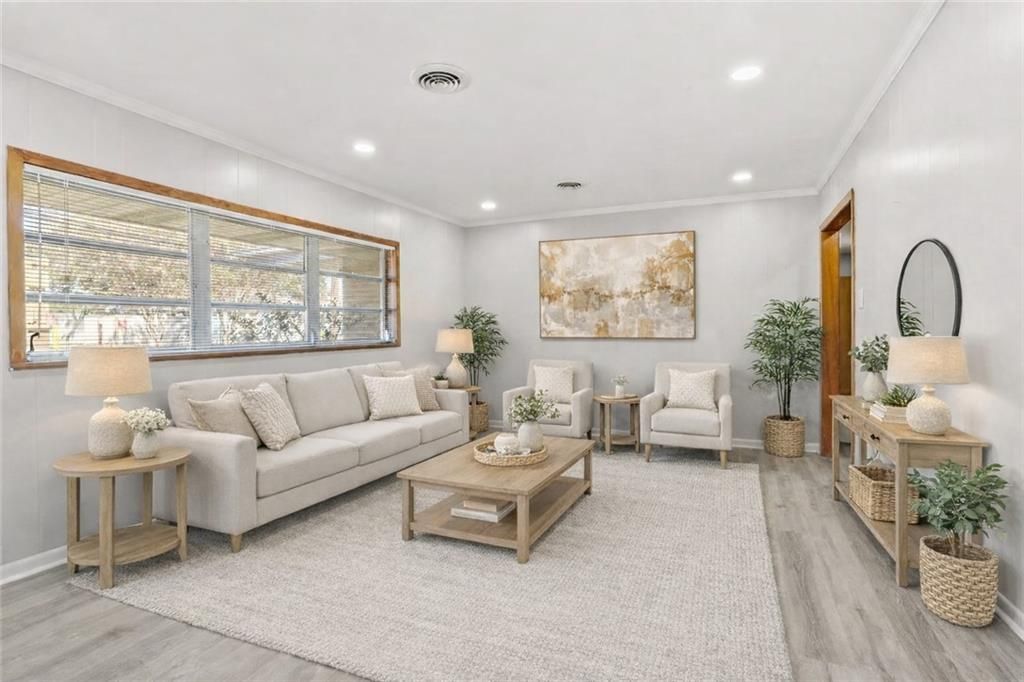 Cute Brick Rancher with amazing storage spaces and great natural light! Enter the living room from the cute front porch. There are 3 bedrooms (1 has ensuite renovated bathroom with shower). All bedrooms have really nice double closets. Renovated full bath off the hallway with pocket door entry. Entertain in the spacious kitchen with two pantries - one is a HUGE lazy Susan! Moveable center island, wood cabinets, new backsplash and fresh paint. Appliances remain. Kitchen is open to dining area (with another closet), large laundry room, and back door to bonus/enclosed patio with water heater, large basin sink and access to an additional workshop, concrete patio and shed. Covered carport and extra parking in the driveway. Large fenced corner lot with a great big yard. House is nicely setback from the road with very little noise. Recently renovated over the last few years - replaced underslab plumbing, replaced roof, covered carport and side fence after Hurricane Ida. Inside updates include vinyl plank flooring, renovated bathrooms, recessed lighting and fresh paint throughout. AC 2017 has warranty paid through 2027. Don't pass this one by!