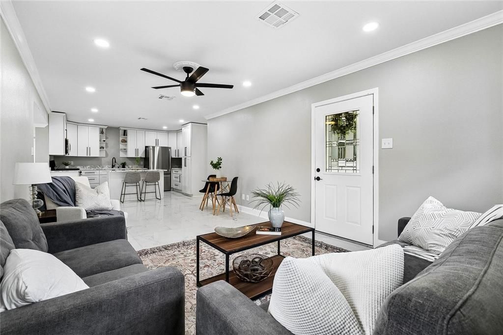 Beautifully updated 4-bedroom, 2-bath home in Metairie, offering modern finishes, a spacious open layout, and great functionality for everyday living. Recent updates include new flooring throughout, a fully updated kitchen with new appliances, all new light fixtures, fresh interior and exterior paint, and all new doors and trim, creating a clean, modern feel with thoughtful upgrades throughout the home. Step inside to a bright open-concept living area featuring recessed lighting, crown molding, neutral tones, and stylish tile flooring that flows throughout the main spaces. The living room connects seamlessly to the dining area and kitchen, creating great flow for both relaxing and entertaining. The updated kitchen offers white shaker cabinetry, stainless steel appliances, marble-look countertops, modern hardware, and a large center island with bar seating. Ample cabinet storage and workspace make this kitchen both practical and visually appealing. The home features four comfortable bedrooms, including a primary bedroom with convenient access to the full bath. The renovated bathrooms showcase modern fixtures, sleek finishes, and a beautifully tiled shower/tub combination. Please note that the 4th standalone bedroom is currently used as an office/flex space but can easily have a closet space added if needed. Additional interior highlights include a dedicated laundry/utility room, updated lighting, and an efficient floor plan that maximizes usable space. Step outside to enjoy the fully fenced backyard, offering privacy and plenty of room for pets, gatherings, or outdoor activities. A storage shed provides convenient additional space for tools, lawn equipment, or seasonal storage. Located in a well-established Metairie neighborhood, this home offers convenient access to local shopping, dining, and everyday essentials. Nearby parks like Lafreniere, schools, and recreation options add to the neighborhood appeal and provide quick access to major roads.