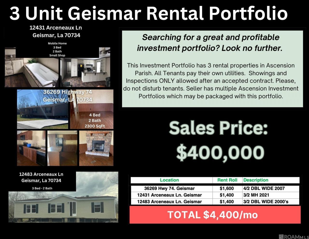 ARCENEAUX RD PACKAGE - 3 PROPERTIES (3 MOBILE HOMES) ADDRESSES: 12431 Arceneaux Ln.; 12483 Arceneaux Ln.; 36269 LA Hwy 74 TOTAL PRICE = $ 400,000. TOTAL INCOME PER MONTH $4,400 OTHER INVESTMENT PORTFOLIO PACKAGES AVAILABLE. ? Hwy 621 Package LCADB #42717389 ? Bluff Rd Package LACDB #42717226 ? Depen Rd Package LACDB #42717655 ? A Mobile Home on an acre on Swamp Rd can be purchased as an add-on with any of the packages within for $139,000