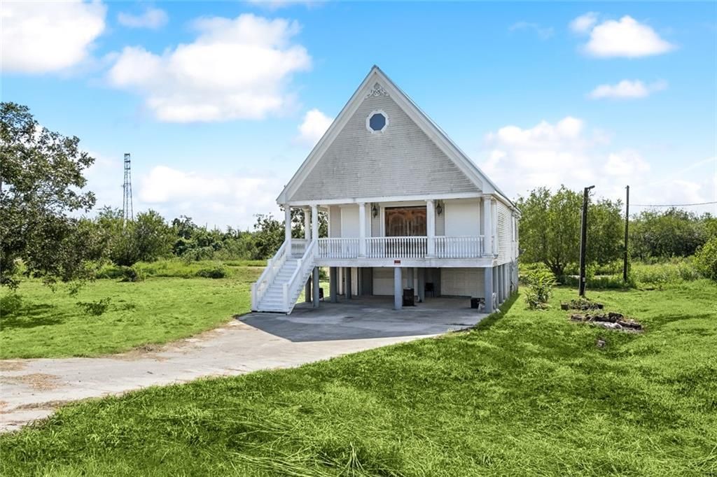 Remarkable property offering character and charm in Empire, Plaquemines Parish. Custom built home raised 9 feet featuring concrete, covered patio and workshop below. Spacious living area offers soaring ceilings. Main living areas encompass first and second floors with third floor including loft as game room as well as Primary bedroom and ensuite. Home includes many enviable features such as antique chandeliers, cypress ceilings, and custom wooden accents throughout. Walk across the street and fish off the bayou. Call today to privately view this beautiful property!