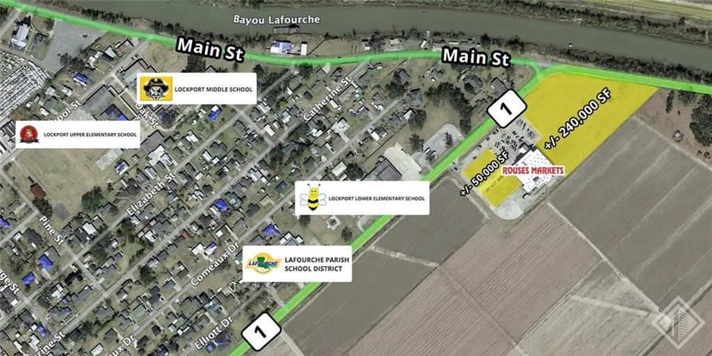 Southeast Commercial is pleased to offer two Rouses Markets outparcels FOR SALE in Lockport, LA. The outparcels are located on the corner of Crescent Avenue and Main Street. The sites have excellent visibility/frontage for any retailer looking to be in one of the only grocery store anchored centers in Lockport. Outparcel 1 is +/- 50,000 SF and Outparcel 2 is +/- 240,000 SF. Outparcels are priced at $1.00/per square foot.