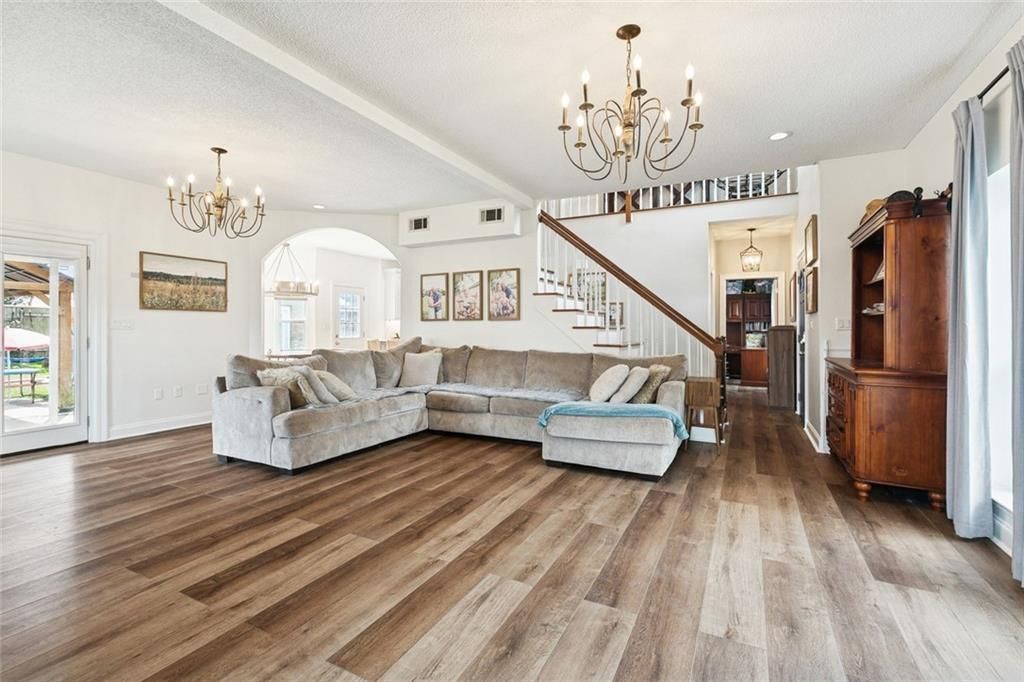 Beautifully updated and move-in ready, this spacious 4-bedroom home offers thoughtful upgrades, flexible living space, and a great backyard setup for entertaining. Step inside to find 9+ ft ceilings and a large living area filled with natural light, overlooking the backyard. The open feel continues with premium luxury vinyl plank flooring throughout the downstairs, providing both durability and style. The kitchen was fully remodeled in 2022 and features custom cabinetry and 3 cm quartz countertops, offering a modern, clean design with plenty of storage and prep space. All kitchen appliances remain (washer and dryer excluded), making this home even more convenient for the next owner. The flexible floor plan includes one bedroom and a full bath on the first floor, great for guests, a home office, or multi-generational living. Upstairs you'll find two additional bedrooms plus a spacious primary suite. Two upstairs bedrooms have new laminate flooring, and the primary bedroom features new carpet. The primary bath includes a double vanity, garden tub, and separate shower. Major improvements provide peace of mind: newer roof (2021); all new energy-efficient windows and new siding (2022); new upstairs HVAC system (2025). The large bran-new covered patio and newly installed back patio create the perfect setup for outdoor entertaining, while the detached building offers incredible versatility?use it as a home office, storage space, workshop, or man cave. Located in an X Flood Zone, this property also offers potential added value with the assumable mortgage option! With over 2,350 square feet of living space, major system upgrades, modern kitchen finishes, and outdoor living space on a nice-sized lot, 15 Pinto Lane is a strong opportunity in St. Rose.