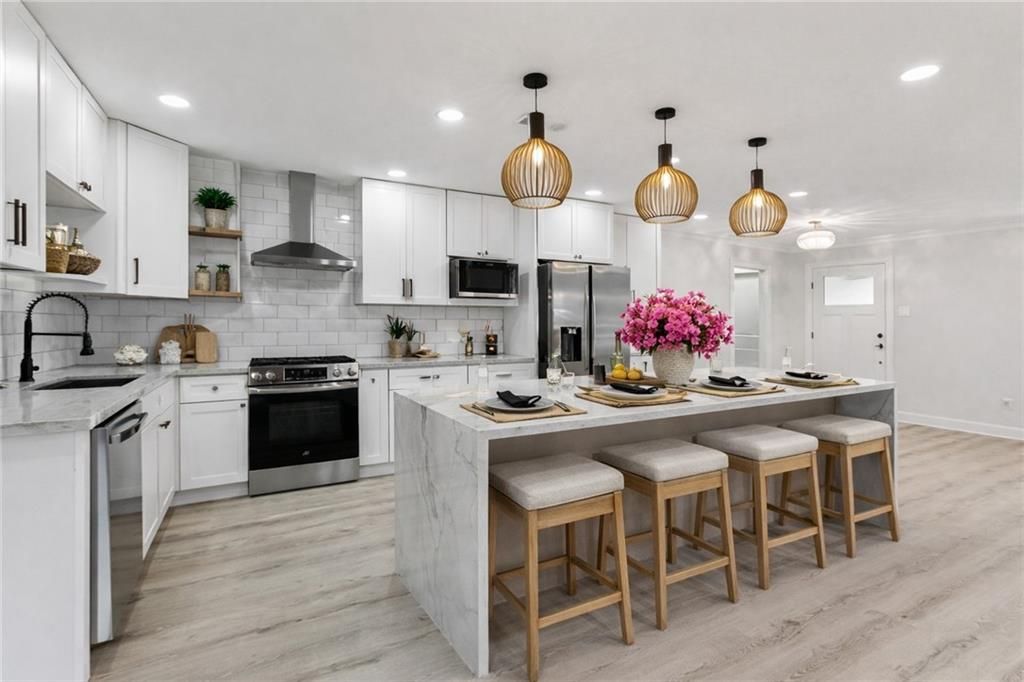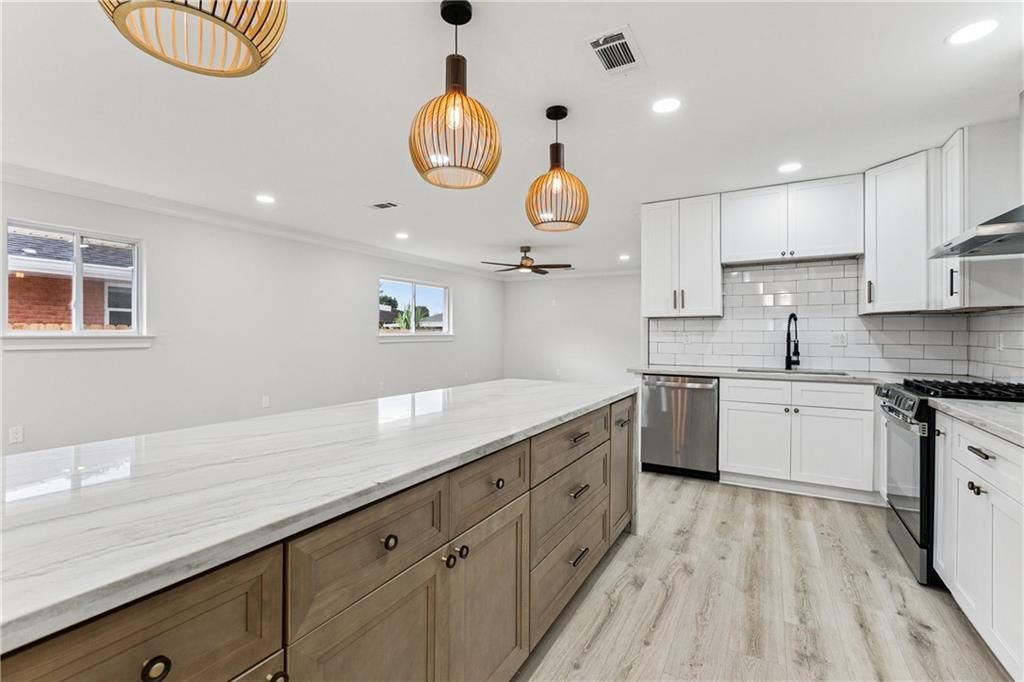 Fully renovated brick home on a spacious corner lot featuring new windows and a 3 year young roof. Interior highlights include engineered wood flooring throughout, a stunning kitchen with a 9-ft quartz island with waterfall edge, counter to ceiling tile, triple pendants above island, & stainless steel appliances. Both bathrooms offer large walk-in showers with the primary bath showcasing a large soaking tub, double sinks and floor to ceiling tile. Dining area opens to double doors that lead to the backyard & a single car garage with standout ceiling LED lighting. Mudroom/laundry room offers a sink, lots of cabinetry & a tankless water heater. Outdoor living includes a covered patio with decorative accent ceiling and lighting. The details have been done for you, just move right on in!