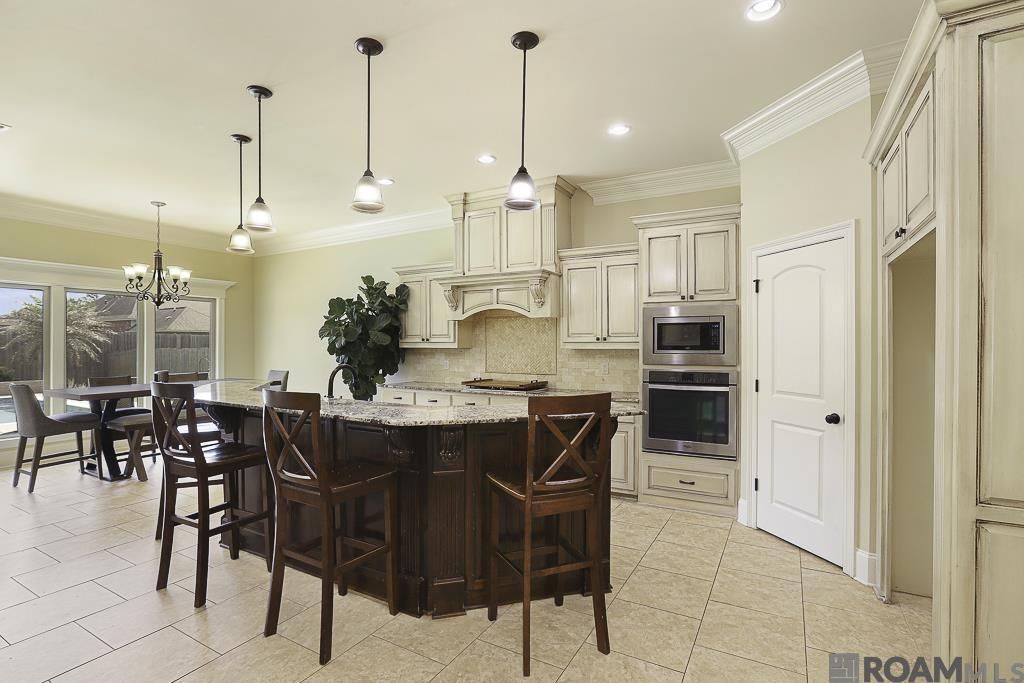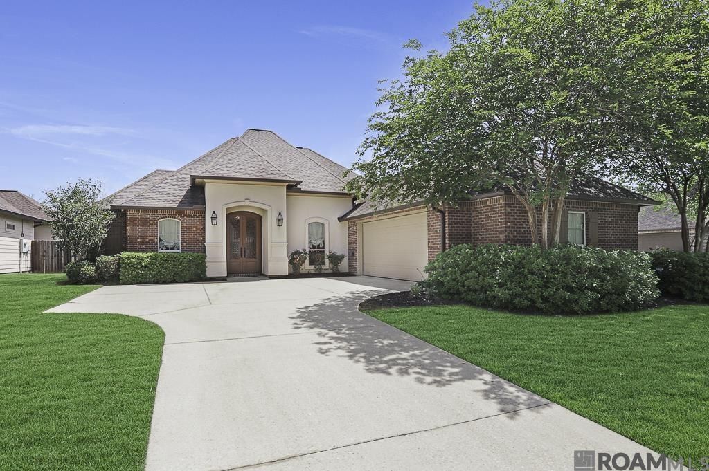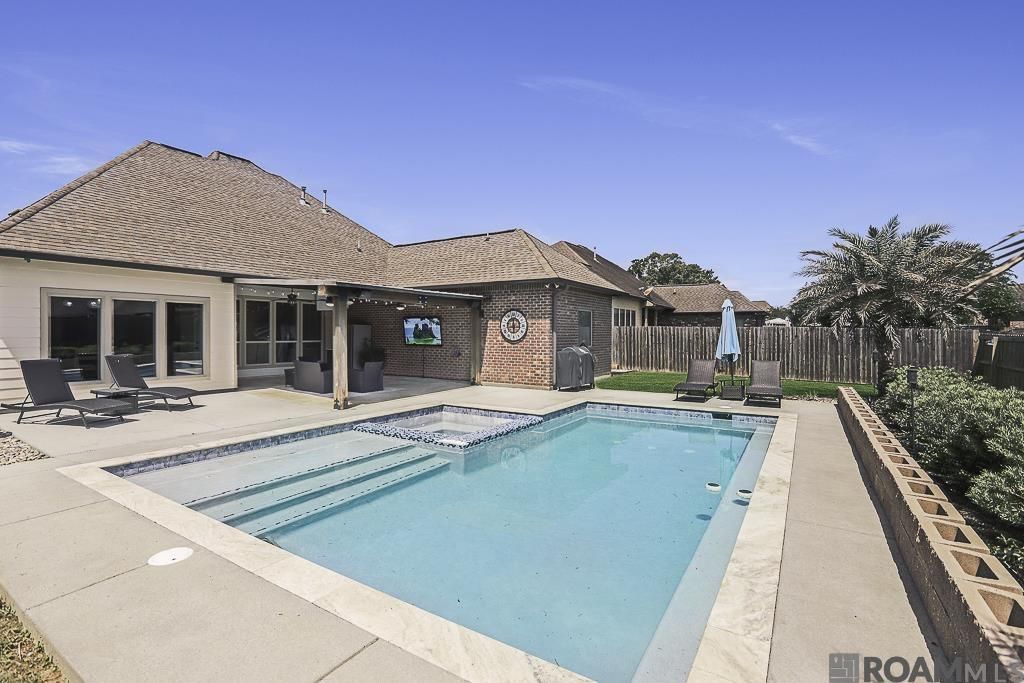 Stunning 4-bedroom, 2.5-bath home in highly sought-after Maplewood Estates in Prairieville! From the charming gas lanterns on the exterior to the custom double arched iron front doors, this home makes a lasting first impression. Step inside to a true foyer that opens into an inviting open floor plan filled with natural light, with windows spanning across the back of the home overlooking your private outdoor oasis. The kitchen is perfectly designed for entertaining, open to the dining and living areas, and features antique glazed cabinets, decorative hood vent, travertine backsplash, gas range, built-in oven and microwave, and a spacious walk-in pantry. The living room offers hand-scraped wood floors, a ventless gas fireplace with built-in bookcases on each side, and elegant triple crown molding. The spacious primary suite features tray ceilings, barn doors leading to the closet, and a luxurious en suite bath with double vanities, granite countertops, soaking tub, and separate shower. This triple split floor plan offers privacy, with two additional bedrooms sharing a hall bath with dual sinks, while the separate guest wing includes another bedroom, half bath, laundry room, and built-in wine bar with fridge?perfect for guests or entertaining. Step outside to your backyard paradise featuring a patio complete with outdoor sink and gas hookup ready for grilling, plus a gorgeous gunite pool with tanning ledge and hot tub. This is truly an outdoor oasis you'll never want to leave!