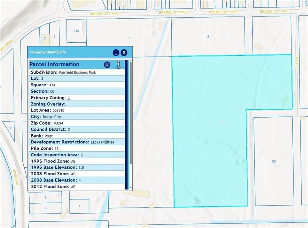 This is a land lease listing only. Prime land lease opportunities are available in Fairfield Business Park located in Bridge City. Square 17A encompasses a total of approximately 17.10 acres (744,684 square feet) and offers excellent visibility and access within an established commercial and industrial corridor. The property is strategically positioned near the Mississippi River and the Huey P. Long Bridge, with convenient access to U.S. Route 90 providing direct connectivity to Interstate 10. The surrounding area borders heavy industrial development, including operations such as Avondale Global, making this location well suited for retail, warehousing, manufacturing, and other industrial uses. Lot 1 consists of approximately 1.43 acres (62,499.88 square feet) with 250 feet of frontage on Bridge City Avenue and additional borders along 12th Street and 13th Street. This parcel is zoned C-2 Commercial and is offered at $0.50 per square foot. Lot 2 contains approximately 2.71 acres (118,274.11 square feet) with 473 feet of frontage on Bridge City Avenue and additional frontage along 13th Street. The property is zoned C-2 Commercial and is offered at $0.50 per square foot. Lot 3 encompasses approximately 12.95 acres (563,910.34 square feet) and is located behind Lots 1 and 2 with access from Bridge City Avenue. The parcel borders 12th Street, 13th Street, Chere Street, and Gail Street. Zoned M-1 Light Industrial, Lot 3 is offered at $0.40 to $0.45 per square foot with a minimum lease parcel of one acre. These parcels present an excellent opportunity for local, regional, and national tenants seeking a strategic location with strong transportation access and proximity to major industrial users. 1 acre minimum on the M1 part.
