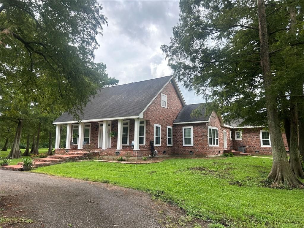 Completely renovated, secluded 3,968 sq. ft .home has 5 bedrooms, 4 full baths, 2 half baths and sits one-half mile off of Highway 39 on 84.75 acres. Great for weekend getaways, hunting, or just enjoying the outdoors. The primary suite has large sitting area, 2 full baths, bedroom with vaulted ceiling and kitchenette. The living room has a fireplace, vaulted ceilings and overlooks the back patio. The kitchen is well appointed with granite counters, stainless appliances, soft close cabinets and drawers. A 1 bedroom, 1 bath apartment with separate entrance is included in the total area. Located just 5 minutes from the Belle Chasse Ferry and 40 minutes from downtown New Orleans. Thinking about investment or developing? Seller has 34 one acre lots plotted on the land between the highway and the house.