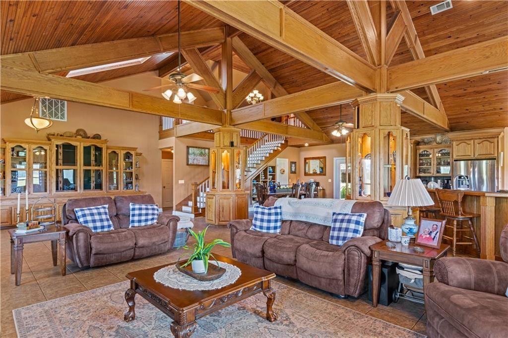 Just under 33 acres of rolling pastures, a private pond, and the kind of peace only country living can bring. This custom home is wrapped in Southern charm, complete with a full wrap-around porch made for morning coffee and sunsets that never get old. Inside, soaring wood beams and a stone fireplace anchor the open living space, while the kitchen sets the stage for Sunday suppers and holiday gatherings with bar seating, custom cabinets, stainless appliances, and a bright dining area overlooking the land. The primary suite offers a sitting area and bath with double vanities, soaking tub, and separate shower. Fully fenced and cross-fenced, the property includes mature pecan trees and multiple outbuildings including a finished shop, 1920 sq ft RV port with camper hookups, 4000 sq ft pole barn, and a cattle corral. With 4 bedrooms, 3 full baths, and room to roam , this home offers the land, lifestyle, and freedom you've been looking for.