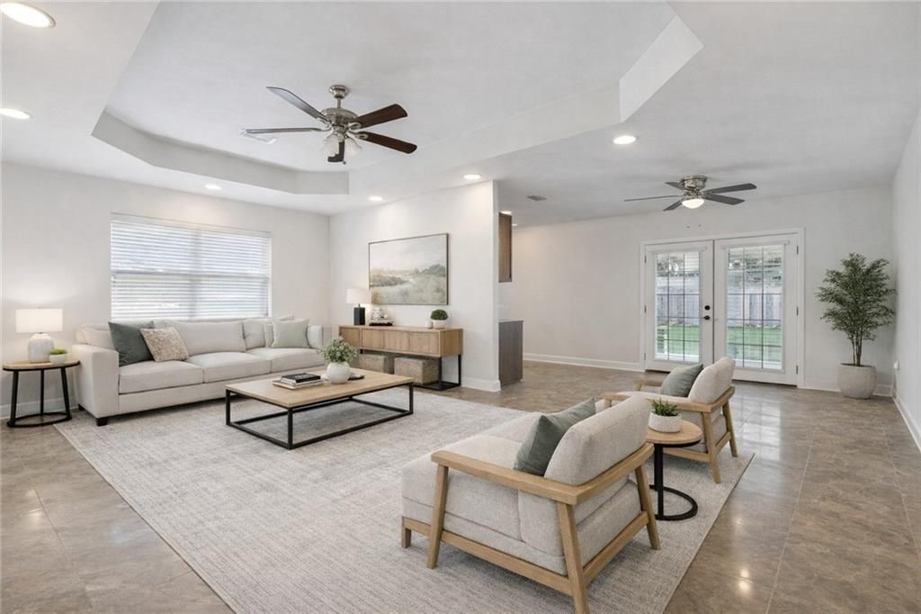 Well maintained brick home with open floor plan and modern finishes. No carpet in bedrooms; porcelain tile throughout living areas. Bright kitchen features granite countertops, stainless steel appliances, and opens to spacious dining room with step ceiling. Generous primary suite with private bath. French doors lead to large screened patio and large yard. Located in preferred X flood zone.* Some images have been virtually altered with paint and staging*