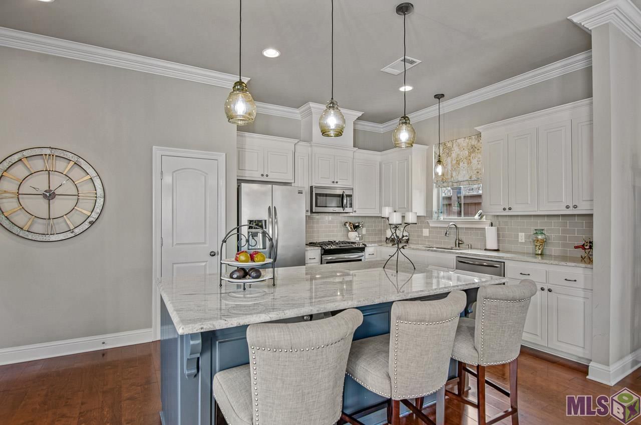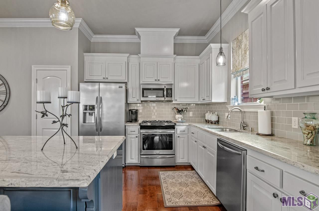 Step into a residence that blends craftsmanship, sophistication, and throughout design. Built by Crawford Home Builders, this exceptional property is presented in impeccable condition and designed for effortless entertaining. The heart of the home is its gourmet kitchen, anchored by an impressive 8-ft. granite island. Custom cabinetry, a gas range, stainless steel appliances, and granite surfaces throughout speak to the level of quality your'd expect in a premium build. The kitchen flows seamlessly into the dining and living areas, where floor to ceiling views rival a private New Orleans-style courtyard, creating a prefect backdrop for gatherings both intimate and grand. 10-ft. ceilings with crown molding frame a inviting living room, complete with a ventless gas fireplace and custom built-ins. Just beyond a substantially sized covered patio expands your living space outdoors, ideal for cocktails at sunset or alfresco dining under the stairs. The primary bedroom is a sanctuary, offering a spa-inspired ensuite with jetted soaking tub, walk-in shower, dual vanities, and expansive walk-in closet. Guest bedrooms are equally spacious, providing ample storage and privacy. A well appointed laundry room with extra cabinetry and workspace adds convenience. This home is wired for surround sound with outdoor speakers, perfect for entertaining. Outdoors, a fully fenced in backyard, gutters, and subsurface drainage. This home had never flooded. Just minutes from I-12, medical facilities, churches and upscale shopping & dining, this neighborhood itself offers a serene lake and abundant wildlife---an oasis of nature within easy reach of city conveniences.