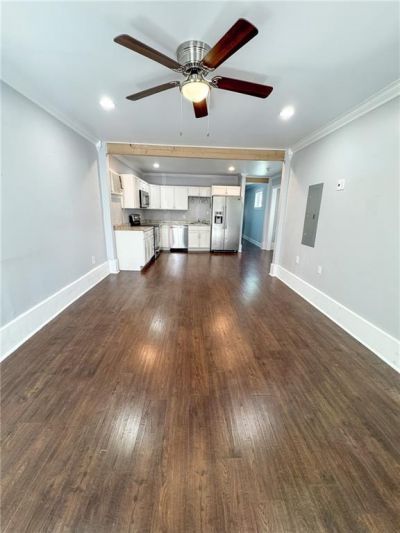 Clean and move-in ready! Entire bottom floor with 2 independent bedrooms and 1 full bath. Big living room opens to the kitchen and dining room. Laundry closet in the hallway with stackable washer/dryer included. Pretty, tiled bathroom with big vanity. Both bedrooms are good size and have closets and ceiling fans. Wood floors throughout. Fenced backyard and deck are shared with upstairs unit. Water stays in owner's name and is included with a capped amount. Tenant responsible for electricity and internet. Dogs under 20lbs and cats are allowed with owner's approval and pet deposit. Available now!