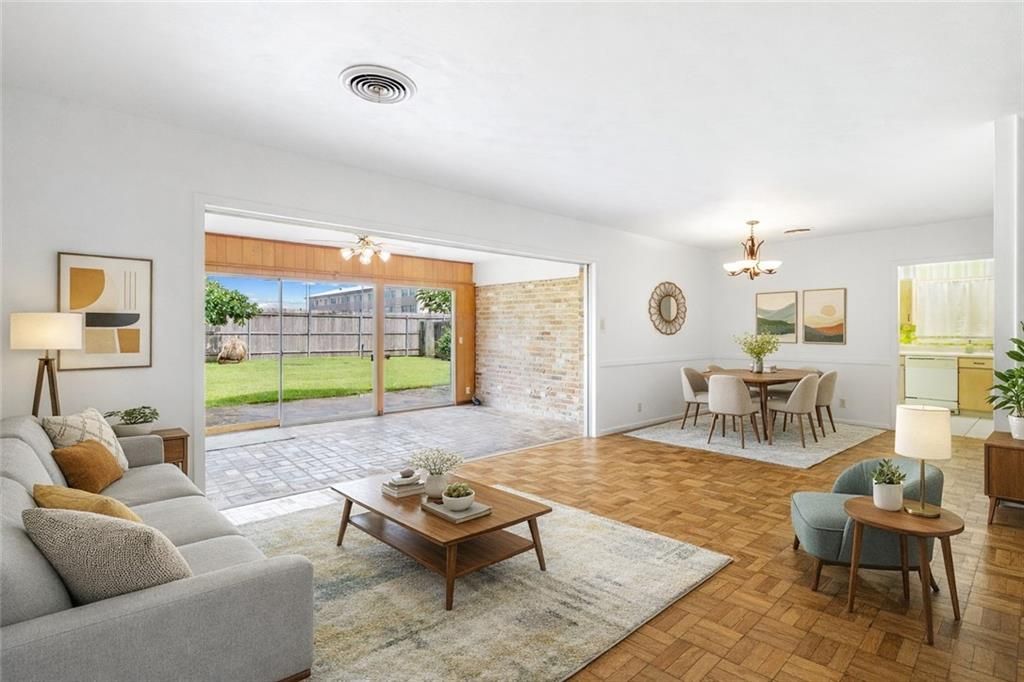 This mid-century ranch, is full of potential in Algiers's Old Aurora Neighborhood! This 3 bedroom, 2 bath is just waiting for your touch to transform it into your dream home. It has a new roof and parquet flooring throughout which will likely never go out of style. The beautiful sunroom with brick flooring, is a versatile flex space conveniently located right next to the dining and living areas. The retro kitchen has the original wallpaper and a bathroom with 60's mint green tile, could be a mid-century modern comeback. The large back yard offers a hand-laid slate patio for a relaxing spot to enjoy the outdoors. The garage is fully fitted with electricity for a useful work-shop. Conveniently adjacent to Holy Cross College, Alice Hart Charter School, and St. Andrew the Apostle Elementary School with an easy commute to downtown New Orleans in 15 minutes. Another bonus is this property is in an X flood zone! This home also qualifies for 100% financing and no PMI as well as a $5k grant. Home is a succession property. Property is being sold AS-IS. Seller will make NO repairs.