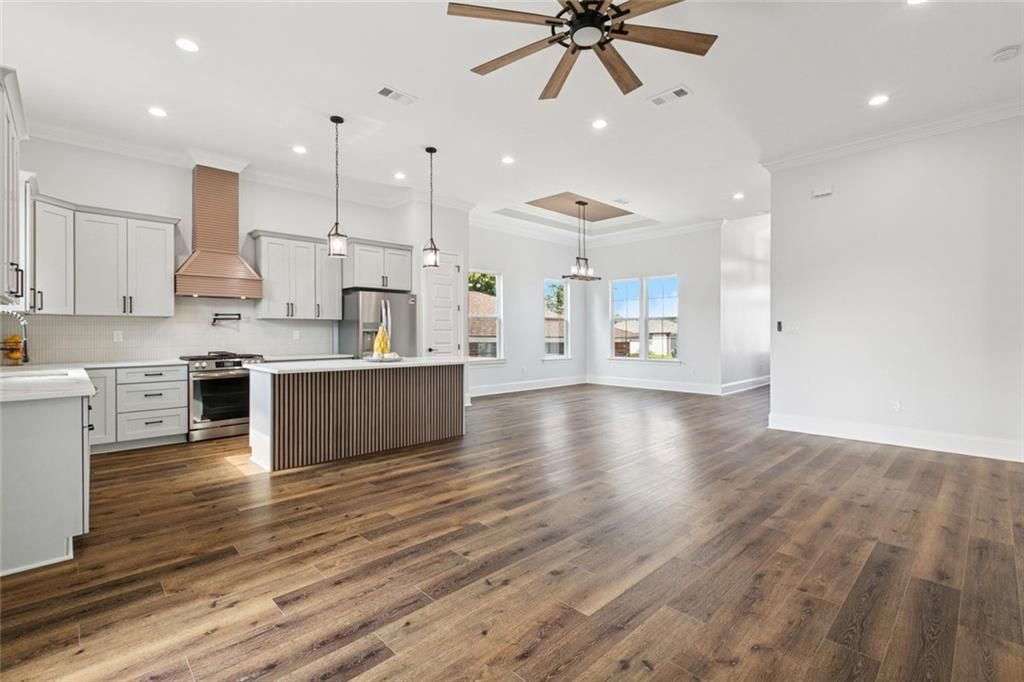 Gorgeous new construction awaits first owner! Beautiful new home featuring a spacious & open floor plan with padded waterproof vinyl flooring, crown molding, high/tray ceilings (11ft-12ft), modern fixtures, & custom trim-work & shelving throughout, tons of natural light, spray foam insulation underneath whole house, gourmet kitchen with high-end appliances, plenty of cabinet space, pantry, quartz counters, & large island overlooking the dining/living areas, as well as a massive primary suite with a spa-like bathroom including glass rainfall shower, soaker tub, dual vanities, & a huge walk-in closet. Large, low maintenance lot with ample curb appeal, generator ready gas meter, and a cozy covered patio overlooking the rear yard all in a quiet neighborhood with quick access to countless local amenities including shopping, restaurants, recreation, I-10 & the New Orleans airport.