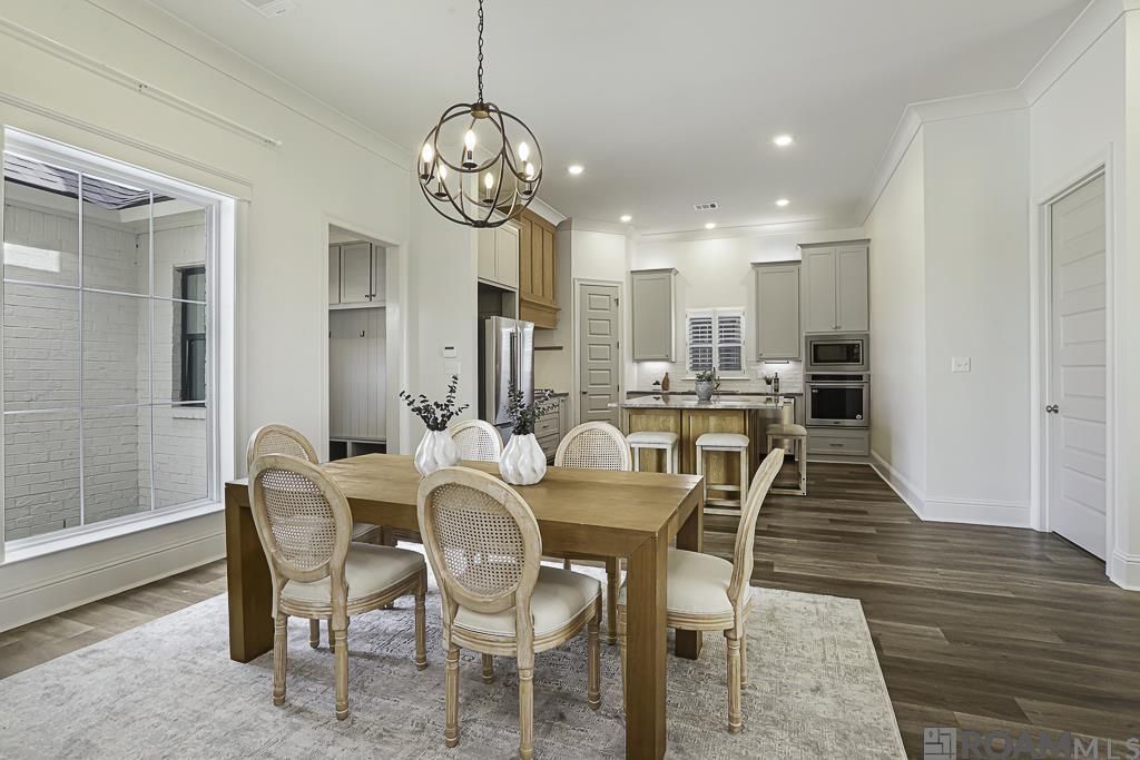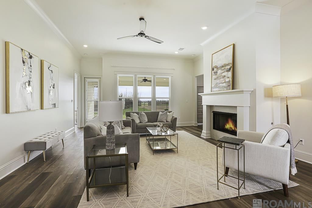 Open House Cancelled. Beautifully constructed by Hometown Homebuilder, Wesley Daniel, this exceptional home is located in the highly desirable Cheval Point community, where timeless design meets an unmatched riverfront lifestyle. The inviting beamed foyer opens to a spacious formal dining room with views of the living room's cozy fireplace, setting the tone for warmth and elegance. The thoughtfully designed floor plan features a set-back kitchen with an adjacent mudroom, offering both functionality and privacy. The forward-facing living room is filled with natural light and highlights the pond views, while tall windows lead to a generously sized covered back patio, ideal for entertaining or relaxing outdoors. The primary suite is a true retreat, highlighted by a breathtaking coffered ceiling. The ensuite bath offers dual vanities, a soaking tub, a spacious shower, a private water closet, and a large walk-in closet with multiple storage areas. Three additional guest bedrooms are thoughtfully positioned on the opposite side of the home for added privacy; two share a bath, while one enjoys its own private ensuite. The chef's kitchen is designed to impress, featuring an oversized island, custom cabinetry, a vent hood, deep drawers, pull-outs, and a walk-in pantry that provide ample storage. A convenient mudroom entry leads in from the 530 sq. ft. garage, complete with additional storage at the stoop. Step outside to enjoy cool river breezes and unforgettable sunsets. This one-of-a-kind community is just a bike ride from LSU and a five-mile commute to downtown Baton Rouge, and will soon feature a community pavilion with grilling spaces for family gatherings and parties. Horse enthusiasts will love this horse-friendly setting, with Farr Park next door and easy access to the levee's four-mile paved path, perfect for walking, biking, jogging, or riding, while taking in peaceful views of cattle grazing around the neighborhood.
