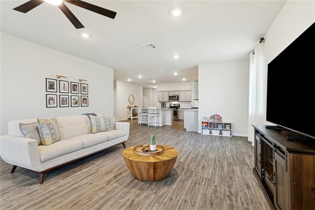 Why wait on brand-new construction when you can have better upgrades, privacy, and move-in readiness now? This beautifully maintained home, just shy of 4 years old, offers features you won't get with most new builds. Enjoy a fully fenced backyard, blinds on every window for immediate privacy, and top-of-the-line ceiling fans with remotes in all bedrooms and the living room. The home features 9-foot ceilings throughout, enhancing the open and airy feel of the open-concept layout. The kitchen and living spaces flow seamlessly, anchored by sleek gray cabinetry complemented by granite countertops and stainless steel appliances. Appliances can remain, making this home truly clean, smart, and ready for its next owner. Smart-home features add modern convenience, while the excellent curb appeal, highlighted by a charming palm tree, sets the tone from the moment you arrive. With 4 bedrooms, 2 bathrooms, and thoughtful upgrades already in place, this home delivers the comfort and value buyers want?without the wait, added costs, or unfinished extras of new construction. Insurance costs are low, and flood insurance is optional, adding to the overall affordability of this home. Beyond the home itself, residents enjoy access to desirable community amenities, including a resort-style pool, fitness center, playground, and basketball courts. This is perfect for both everyday living and weekend fun. Additional highlight: an assumable 4.125% interest rate is available for qualified VA or FHA buyers, subject to approval through the current mortgage servicer.