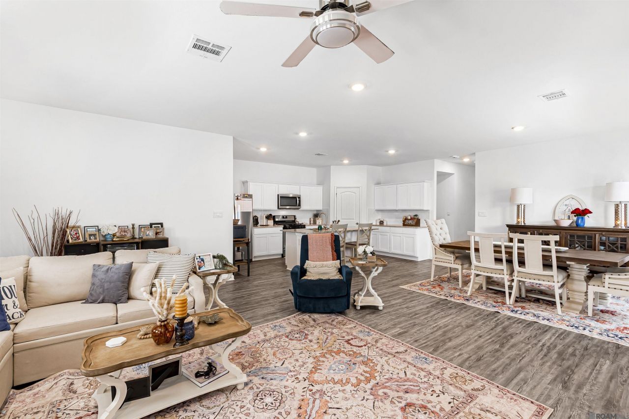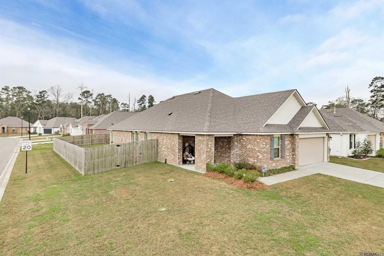 Rare find in Denham Springs! This spacious 5-bedroom home sits on a large corner lot in a small, well-kept subdivision. A fully fenced yard provides the perfect setup for pets, play, or outdoor entertaining. The heart of the home features a large, open living area that flows effortlessly into the dining space and kitchen. The kitchen is well-appointed with an island with barstool seating, gas cooktop, corner pantry, granite countertops, and stainless steel appliances. The primary suite offers a private retreat with an attached en suite bathroom featuring dual vanities and a separate tub and shower. Other thoughtful upgrades are found throughout the interior, including wood blinds, updated plumbing fixtures in the kitchen and bathrooms, and ceiling fans added to three bedrooms for enhanced comfort. The home is equipped with gas appliances and a tankless gas water heater, delivering efficiency and reliability. Security is a standout feature, with a system that includes three outdoor cameras and sensors on every door and window, with ADT monitoring available for added confidence. With five true bedrooms, modern conveniences, and a desirable corner-lot location, this home is a rare opportunity in today's market. Schedule your showing today!