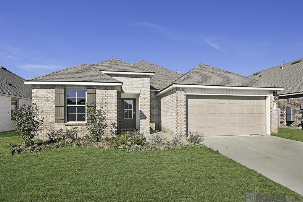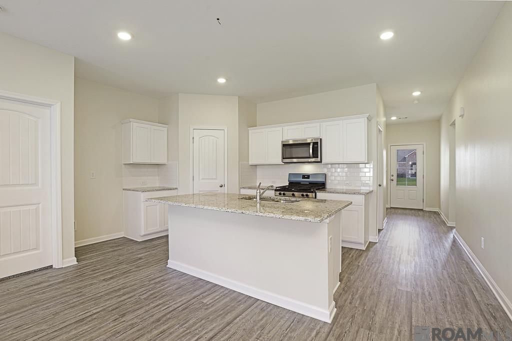 Precious 3 bedroom, 2 bath home in Denham Springs featuring a welcoming foyer and an open floor plan ideal for everyday living. Beautiful laminate flooring flows throughout the main living areas, complemented by a bright, neutral color palette. The kitchen opens to the living room and offers granite countertops, white cabinetry, white subway tile backsplash, stainless steel appliances, an island with undermount sink, and a walk-in pantry. The primary en suite features double windows, double vanities with granite countertops, white cabinets, a soaking tub, walk-in closet, and a private water closet. Split floor plan provides privacy, and the guest bathroom also offers granite countertops. Perfect as a starter home for a growing family or a great option for those looking to downsize.
