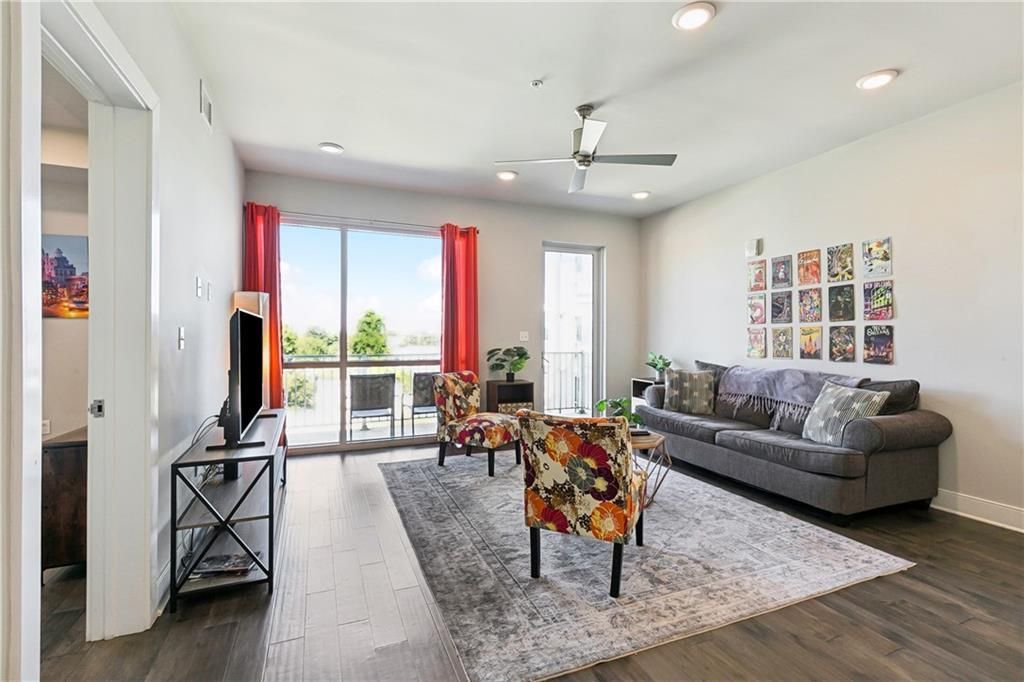 Modern condo available for lease or for sale in the Bywater neighborhood. Unit 419 at 900 Bartholomew Street offers an open floor plan with large windows, high ceilings, and quality finishes throughout. The kitchen includes stainless steel appliances, quartz countertops, and custom cabinetry that flows into the living and dining areas. A private balcony overlooks the neighborhood and pool area. The residence is offered fully furnished, providing a turnkey opportunity for comfortable living or investment. The Saxony Condominiums feature gated entry, garage parking, a fitness center, outdoor pool, and landscaped courtyard. Conveniently located by Crescent Park, the riverfront, restaurants, and local art galleries, good for low-maintenance living in a vibrant New Orleans community.