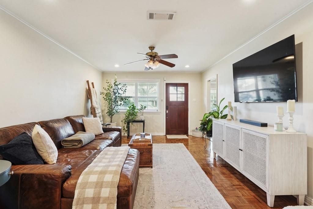 1st Showing March 2, 2026. Welcome to a lovely home to call your own! The open floor plan is conducive for entertaining - walk through the inviting den to the dining room and the delightful kitchen. The dining room has an attractive built-in hutch/bar with granite countertops and wine cooler. Updated kitchen has stainless steel appliances including a gas range/oven, refrigerator, dishwasher, microwave and disposal, along with a big pantry, and a bar area for guests to converse with the cook! Gleaming refinished parquet wood floors are thru-out the home, except for the baths and kitchen. The 3 bedrooms are spacious with large closets and the baths have been updated. Single car garage w/electric door opener, large covered patio, shed, fenced back yard with sub-surface drainage to street. Termite Contract. Roof - 2019. Windows - 2017. AC inside equipment - 2021.