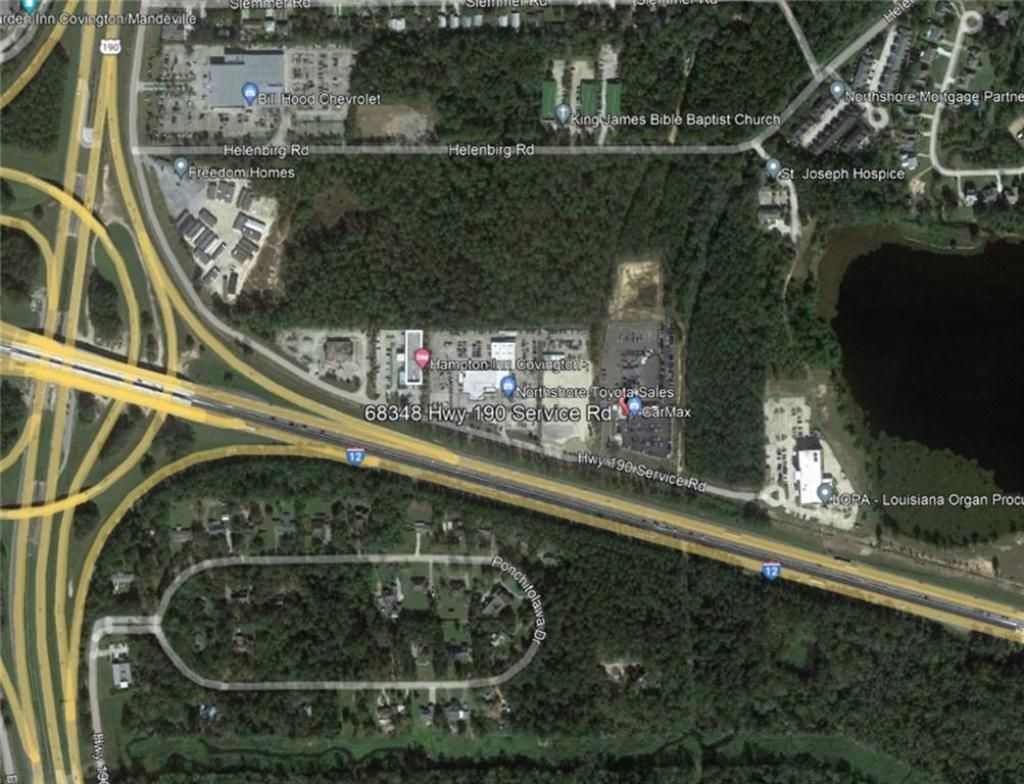 11.28 acres with prominent visibility from I-12. Located between CarMax and LOPA, and is near Kia of Covington (currently under construction). Accessible through the I-12 service road and Helenberg Road. The 6 acres with frontage along I-12 is zoned as HC-3. HC-3 zoning offers a wide variety of possibilities, including all HC-2 uses as well as large auto dealerships, indoor recreation, theaters, storage facilities, transportation terminals, Big Box retail, and more. Preferred Flood Zone X. This location is along the I-10/I-12 corridor, granting access to I-55, I-59, and the Causeway. 5.28 acres with frontage on Helenberg Rd. has NC1 zoning. Both parcels total 11.28 acres.